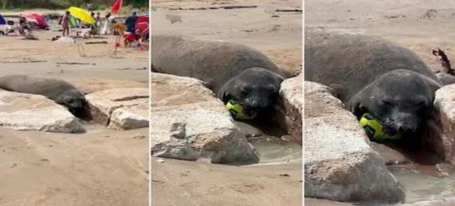 Sin embargo, la tranquilidad cambió con la aparición de un elefante marino que se acercó con curiosidad al lugar donde jugaban. En las imágenes se observa cómo el animal se aproxima a la pelota, la examina y finalmente apoya su cabeza sobre ella, como si la hubiera adoptado. La escena causó sorpresa entre los presentes, quienes no esperaban que su juego fuera interrumpido por un visitante tan peculiar.